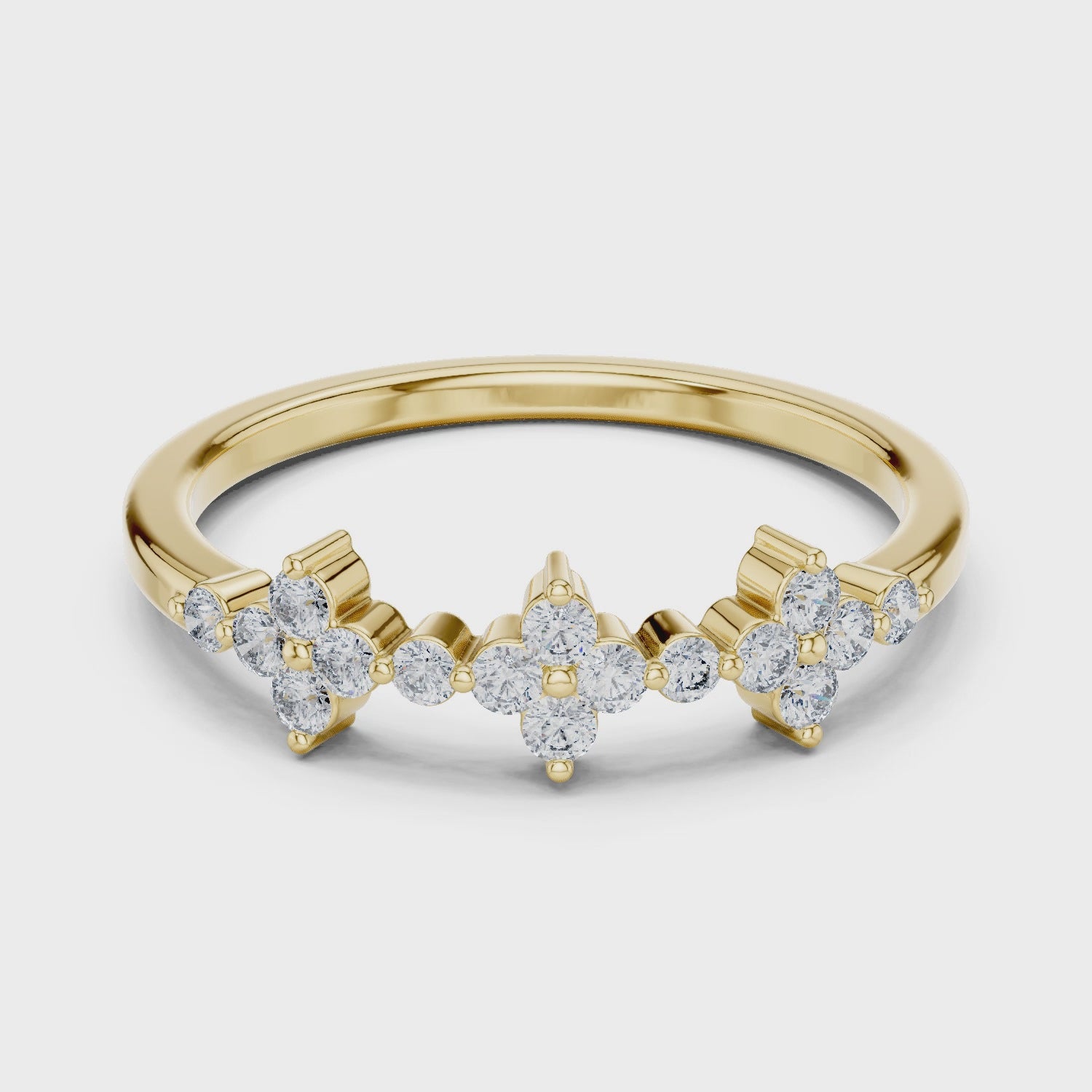 A graceful contour ring from MUUR Fine, designed to arc softly across the finger—or nest neatly against solitaires and ovals. Sixteen round brilliant diamonds are arranged in petite collet clusters along a gently curved crest, each stone secured by fine bead prongs and open backs that invite light from every angle. The low gallery keeps the profile close to the hand for everyday comfort, while the slim half-round, comfort-fit shank makes this a perfect stacking band or wedding contour. Crafted in 14K yellow gold and available in 18K, platinum, or sterling silver. Responsibly grown lab diamonds are standard for brightness with a lighter footprint; natural diamonds are available on request. Hand-finished to a high polish with crisp edges and precise tolerances—refined, modern, unmistakably MUUR Fine.