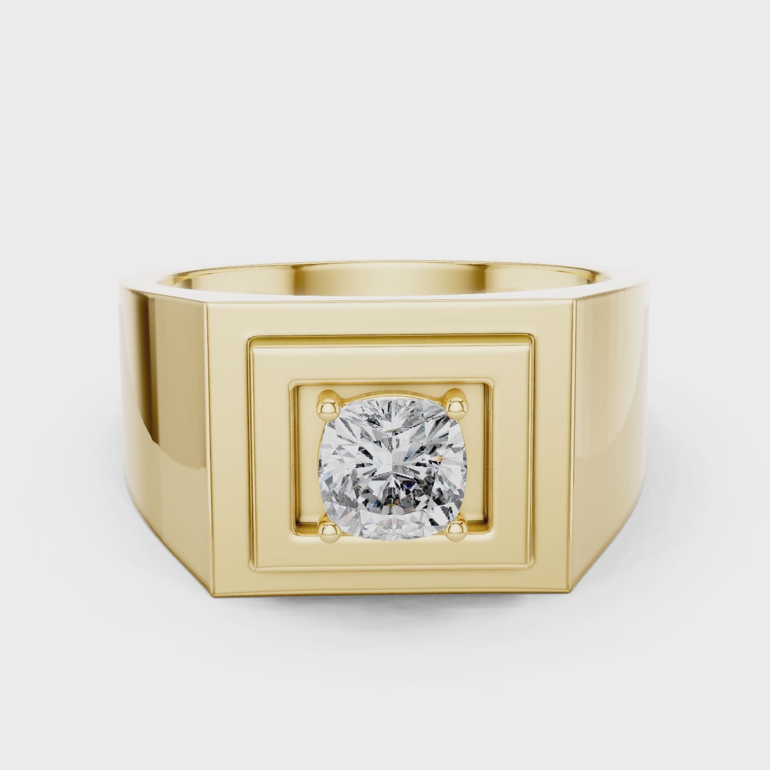 A bold, architectural take on a classic men’s signet. From MUUR Fine, this ring centers a cushion-cut diamond (approx. 5.50 × 5.50 mm, ~0.85 ct) secured in a low collet with crisp four-prong corners. The diamond sits on a stepped, square platform that frames the stone and amplifies its fire, while open geometric galleries allow light to circulate beneath the head. A solid, tapered signet shank balances presence with comfort and a sleek high-polish finish. Choose an ethically grown lab diamond for modern sustainability or request a natural diamond to your specification. Designed to be worn daily, this clean, masculine silhouette pairs effortlessly with tailoring or streetwear and engraves beautifully for a personal touch.