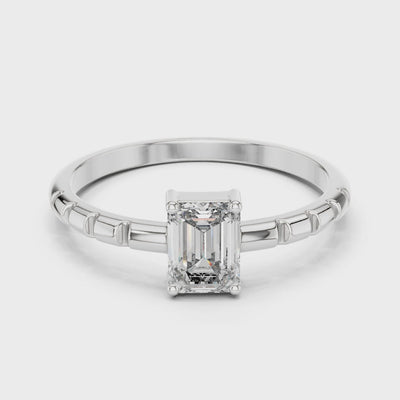 A refined take on the modern solitaire. From MUUR Fine, this ring centers an emerald-cut diamond measuring approx. 5.50 × 4.00 mm (~0.50 ct) secured in a square collet/basket crown with four protective corner prongs. The low, open gallery keeps the silhouette elegant while allowing light to move through the pavilion for crisp step-cut flashes. Sculpted shoulders flow into a slender half-round band with subtle notched accents—delicate enough for stacking yet substantial for everyday wear. Meticulously finished in high-polish 14K yellow gold, the design may be set with an ethical lab-grown diamond (recommended) or natural by request. Handcrafted to order with precise tolerances for a comfortable, balanced fit.