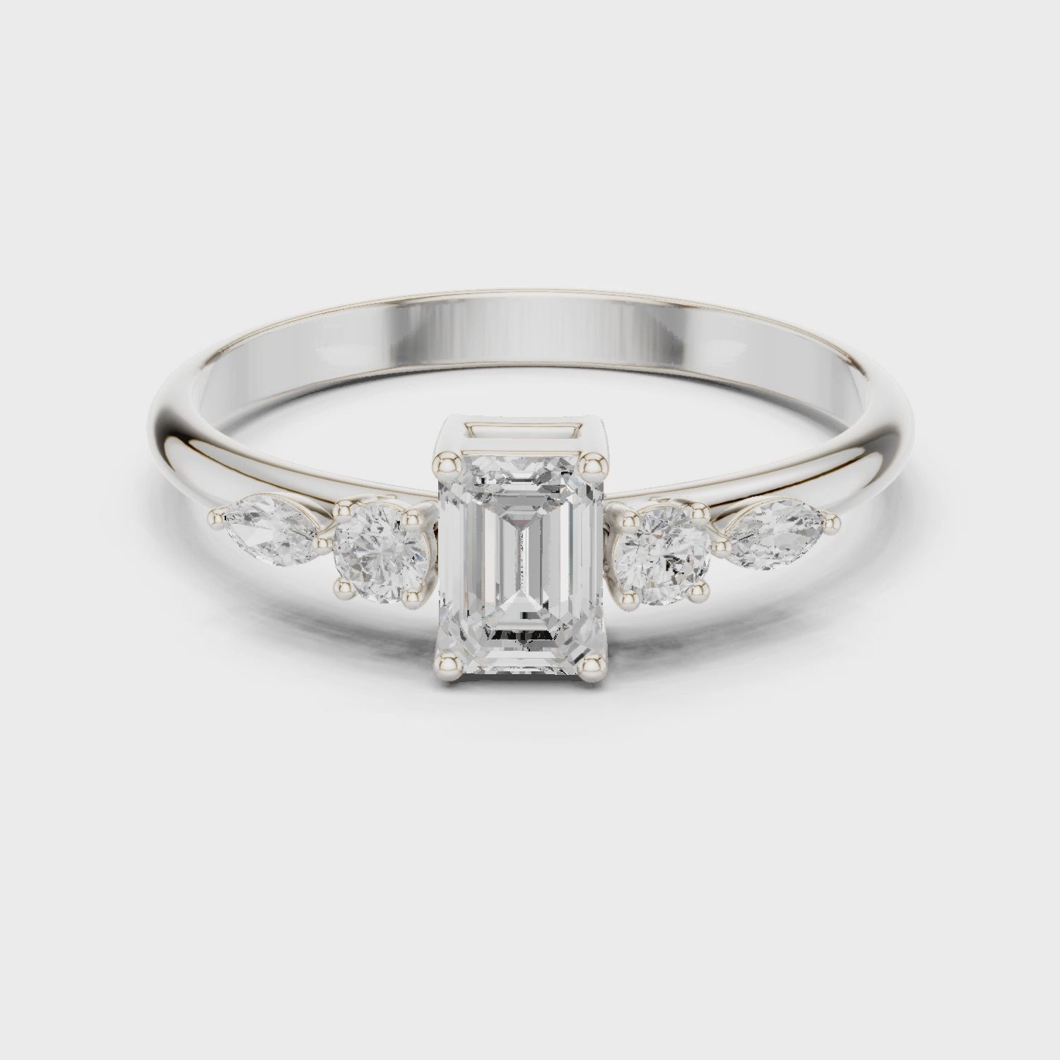 A modern five-stone silhouette from MUUR Fine, crafted in solid gold or platinum. The center is a step-cut emerald diamond (≈5.0 × 3.5 mm) held in a refined open collet with crisp corner prongs for maximum light return. Flanking the center, paired marquise accents (≈3.0 × 1.5 mm) and petite round brilliants (≈2.2 mm) graduate along tapered shoulders, creating a balanced sparkle line that wears beautifully alone or with a wedding band. The half-round shank is slim and comfortable, tapering toward the head for an elegant profile. Made to order with ethically grown lab-created diamonds as standard—natural diamond available on request. Finished to a high polish with precise stone seats and clean galleries, this ring delivers everyday comfort and heirloom presence in one thoughtful design.