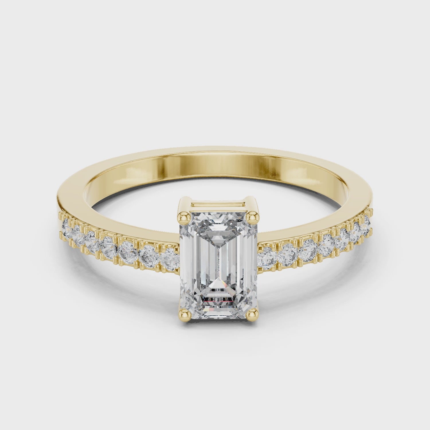 A refined MUUR Fine solitaire that pairs an emerald-cut center with micro-pavé diamond shoulders for crisp, modern sparkle. The 6.0 × 4.0 mm emerald sits in a low collet with four round claw prongs, lifting the stone just enough for light while keeping a sleek profile for everyday wear. An open cross-bar gallery brightens the side view, and the slim half-round band stacks effortlessly. Hand-finished in 14K yellow gold (also in 18K, platinum, or sterling), this design is built with precise tolerances, polished edges, and responsibly grown lab diamonds by default (natural available on request). Elegant, durable, and quietly striking—an engagement ring you’ll reach for daily.
