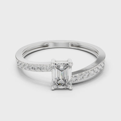 From MUUR Fine, this modern solitaire showcases an emerald-cut center in a refined basket/collet head with four secure corner prongs. A bright line of pavé round brilliants accents the shoulders, adding scintillation while keeping the focus on the elongated 5.5×4.0 mm center (~0.50 ct). The band is a gently tapered, half-round comfort shank (~1.8–2.2 mm) that sits smoothly on the hand. An open gallery lets light flood the stone for crisp, hall-of-mirrors flashes—perfect for an elegant, everyday engagement style. Crafted in 14K yellow gold with a high-polish finish (hallmark 585), and available in 18K or platinum. Choose a lab-grown diamond for a responsibly made, identical-to-nature sparkle or select natural by request. Made to order with precise setting and clean micro-pavé, this ring balances timeless geometry and contemporary finesse.