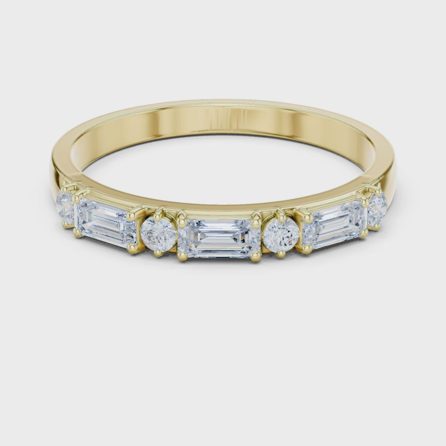 A refined stacking-friendly diamond band from MUUR Fine, set with three step-cut emerald-shape diamonds framed by four petite round brilliants. The 4.00×2.00 mm emerald cuts (approx. 0.28 ct total) sit in sleek open collet baskets with four refined claw prongs, while the 1.70 mm rounds (approx. 0.08 ct) are secured in miniature collets for a crisp, architectural line of light. The half-round band tapers gently for comfort and balance, making it an elegant stand-alone ring or perfect companion to engagement rings and solitaires. Crafted in 14K yellow gold with a high polish and ethical lab-grown diamonds (natural diamond available by request), this low-profile design offers everyday wearability without sacrificing sparkle.