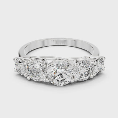 From MUUR Fine, this five-stone anniversary ring showcases a graduated row of round brilliant diamonds in open collet baskets that lift light through each facet. A 6.0 mm center (~0.85 ct) is framed by 5.0 mm and 4.0 mm side stones for balanced sparkle across the finger. Petite claw prongs secure every stone while keeping the silhouette airy. The tapered, half-round shank sits comfortably for daily wear and finishes in a luminous high polish. Crafted in 14K yellow gold with optional 18K or platinum, this design is engineered for longevity with a refined under-gallery and smooth shoulders. Choose lab-grown diamonds for an ethical, traceable choice or select natural diamonds to your preferred color and clarity—each ring is made to order by MUUR Fine artisans for an impeccable fit and finish.