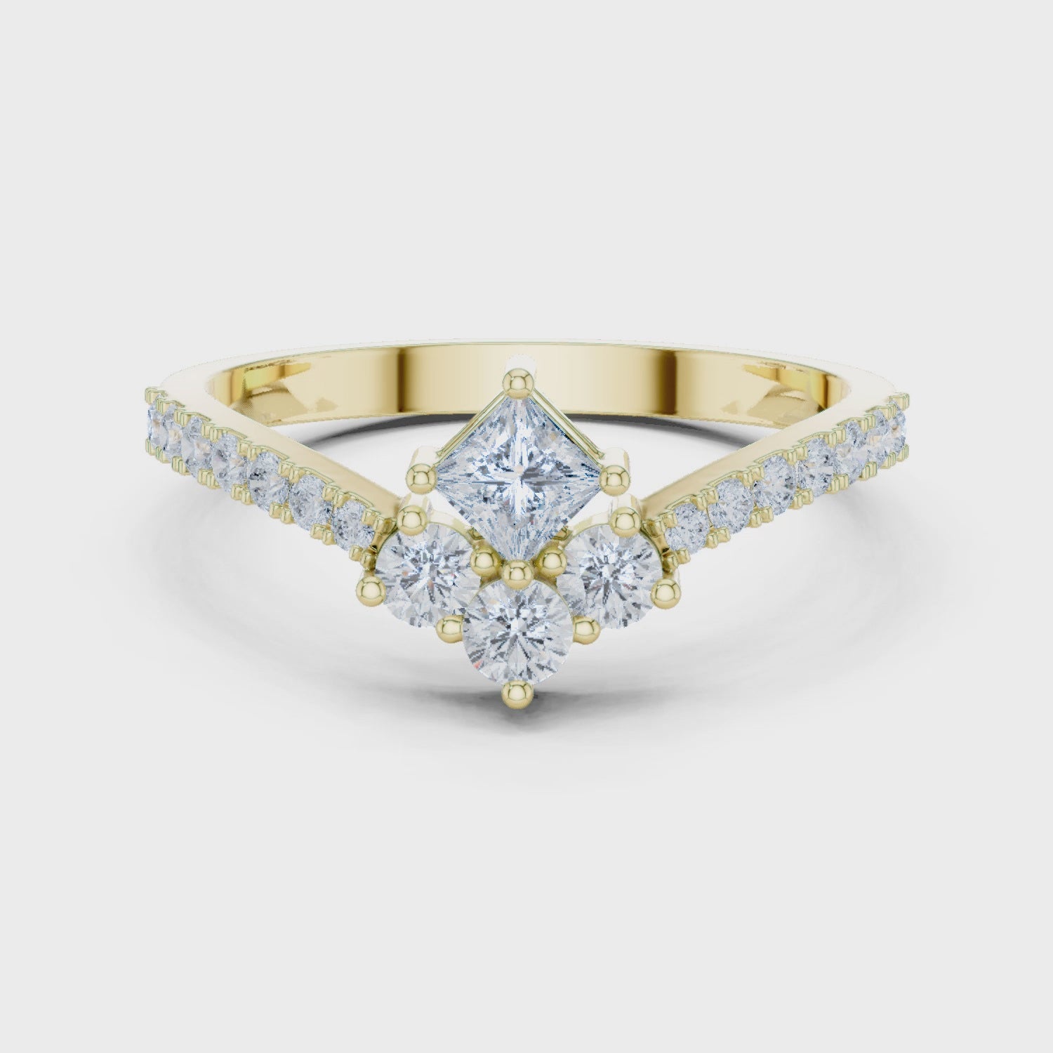 A modern take on a diamond cluster, this MUUR Fine ring layers graduated round brilliants in sculptural “steps” and traces one shoulder with micro-pavé sparkle. The feature stones (3.0 mm, 2.5 mm and twin 2.4 mm) are secured in crisp collet cups with petite claw prongs, while the melee (≈1.2–1.5 mm) is delicately bead-set along a single shoulder for a refined, asymmetrical look. An open bar gallery keeps the profile airy and lets light reach every facet. The band is slim and slightly tapered (≈1.8–2.0 mm) with a comfortable half-round interior, ideal for daily wear or stacking. Crafted to order in 14K yellow gold with optional 18K, platinum, or sterling silver, and set with responsibly sourced lab-grown diamonds (natural by request), this design balances fresh geometry with timeless elegance.