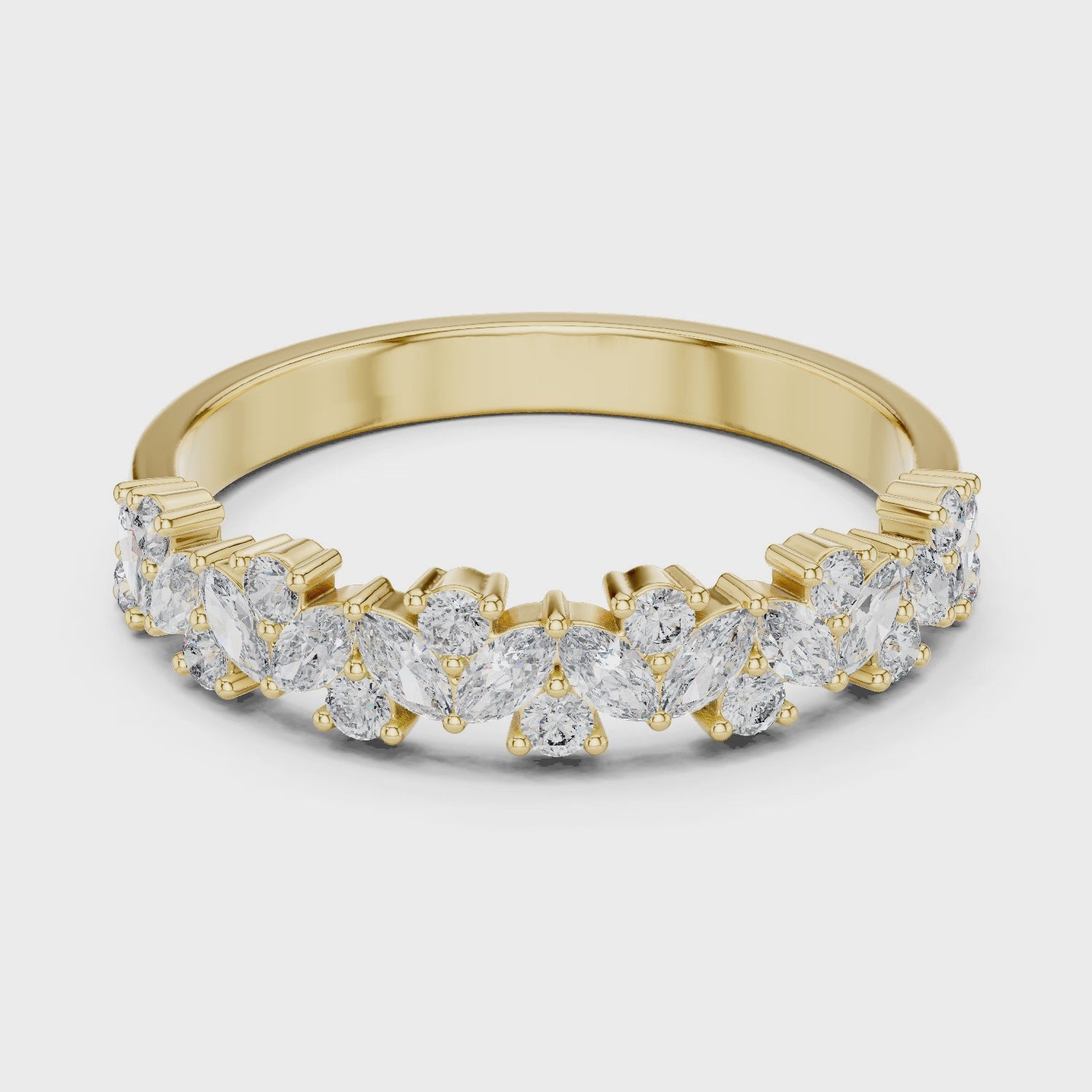 A refined take on the classic diamond band, this MUUR Fine design alternates marquise and round brilliant stones across a slim half-eternity silhouette. Petite collet-style baskets with delicate claw prongs keep each diamond secure while an open, scalloped gallery invites light from every angle for extra sparkle. The 14K yellow gold shank is softly half-round with a comfortable inner profile, ideal for stacking with an engagement ring or wearing solo as a wedding or anniversary band. Set with responsibly grown lab-grown diamonds (natural available by request), the piece balances modern ethics with timeless craft. At approx. 2.0–2.2 mm in width and ~2.4 mm rise, it delivers everyday elegance without bulk—perfect for a refined, luminous line of fire on the hand.