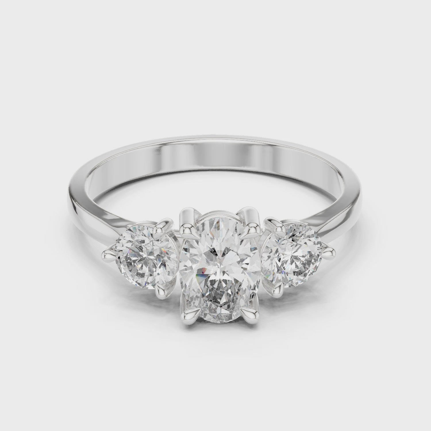 From MUUR Fine, this refined three-stone engagement ring frames a luminous oval center with perfectly proportioned round side stones for enduring balance and sparkle. The ~7.0×5.0 mm oval (approx. 0.66 ct) is secured in a clean collet/basket head with four round prongs, flanked by two ~4.2 mm round brilliants (approx. 0.31 ct each). A gently tapered, half-round band keeps the silhouette airy and comfortable while drawing the eye to the stones. Hand-finished in 14K yellow gold with high polish, the open gallery invites light through every facet for maximum fire. Choose lab-grown diamonds for modern, responsible luxury, or select natural diamonds per your preference. Made to order in your size, this is a timeless MUUR Fine classic designed to stack beautifully with straight or slight-curve wedding bands.