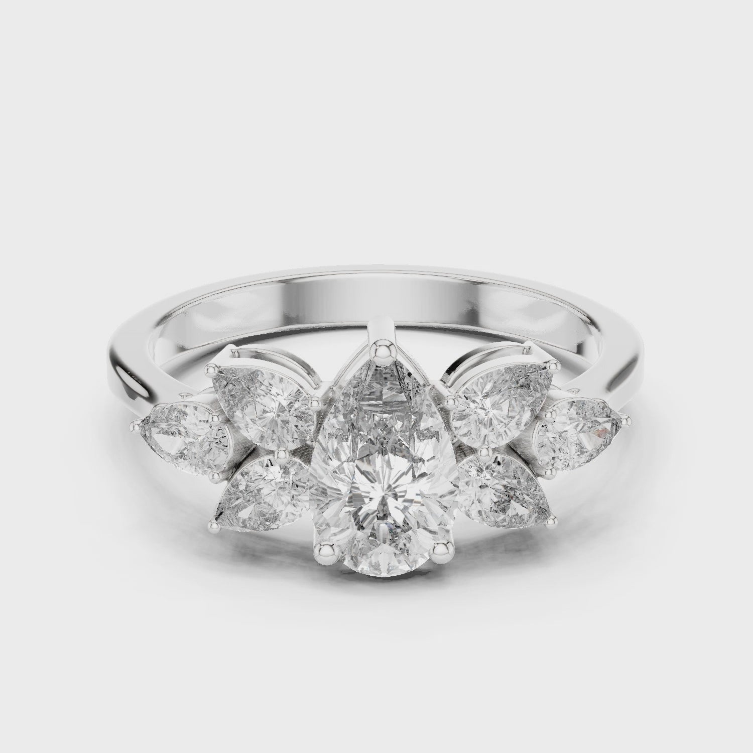 A luminous statement from MUUR Fine, this seven-stone ring frames a pear-cut center in a sculptural collet setting and completes the tableau with six matching pear accents. The 8.0×5.0 mm center (~0.75 ct) sits secure in a bezel-backed head with fine claw tips, while the surrounding pears (~0.09 ct each) create a graceful marquise-style cluster that elongates the finger. Smooth, non-cathedral shoulders flow into a refined half-round band for everyday comfort. Hand-finished in 14K yellow gold with high polish, the design balances drama and wearability—perfect as an alternative engagement ring or a luminous right-hand piece. Choose ethical lab-grown diamonds or request natural diamonds; stone quality is tailored per your selection. Made to order, your ring is crafted with precise tolerances and inspected at each stage for brilliance and secure setting.