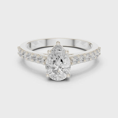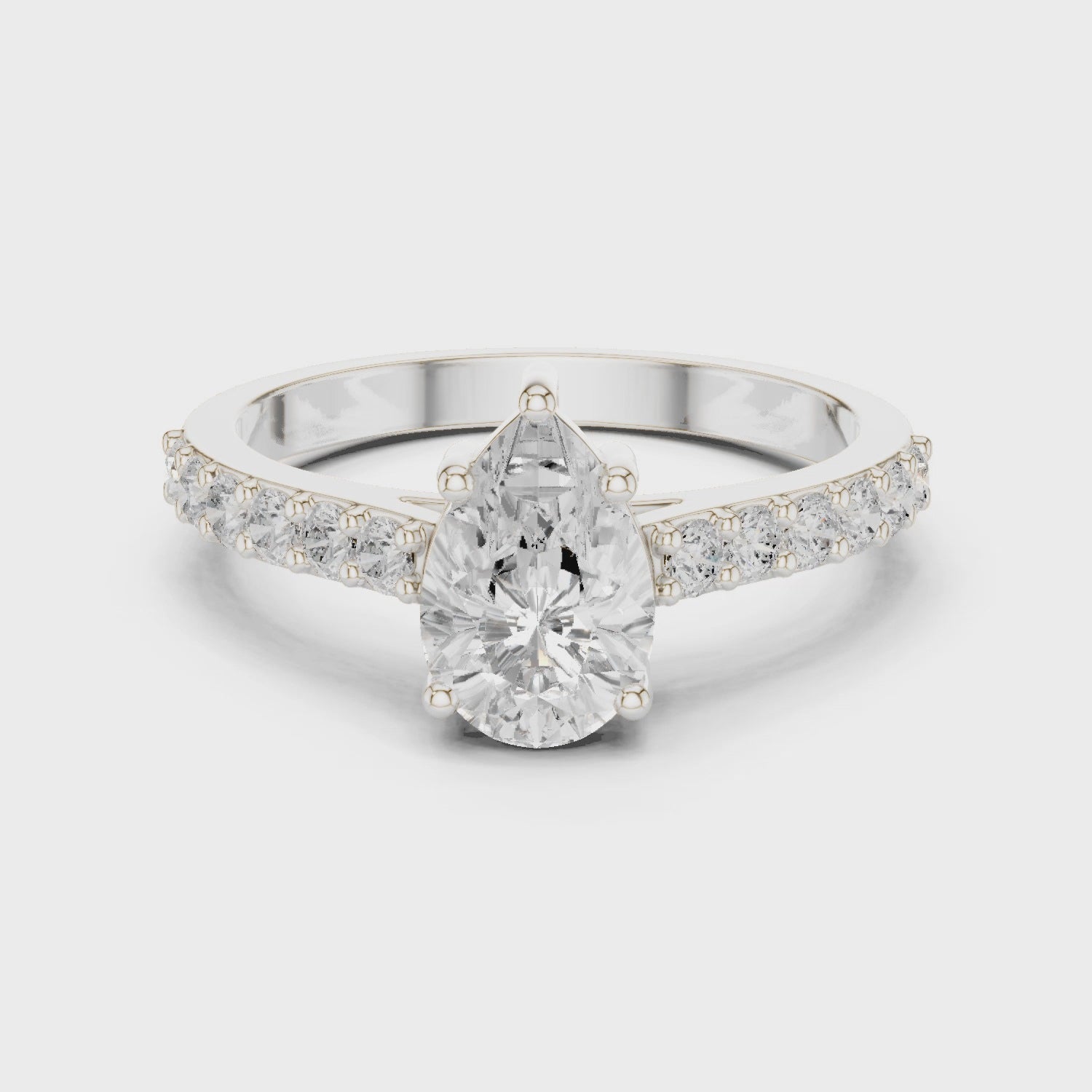 A modern classic from MUUR Fine, this pear-cut solitaire features a luminous 8.75×5.75 mm center held in a refined five-prong basket and framed by a slim pavé band. Sculpted cathedral shoulders lift the stone to the light while an open gallery maximizes brilliance and ease of cleaning. Twelve prong-set round brilliants along the shank add a delicate line of sparkle without overpowering the center. The half-round, comfort-fit band keeps a graceful profile that wears beautifully every day. Crafted in 14K yellow gold with options in 18K, platinum or sterling silver, and offered with lab-grown diamonds for an ethical, traceable choice (natural diamond by request). Designed for balance, security and scintillation—an elegant engagement ring with contemporary proportions.