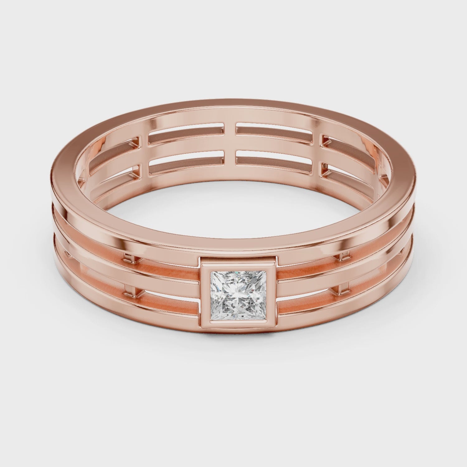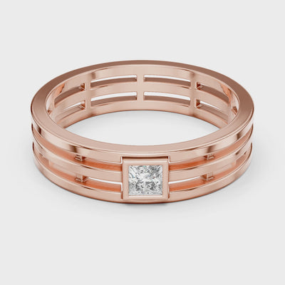 Bold, modern, unmistakably MUUR Fine. This statement band frames a square princess-cut diamond in a clean bezel, set flush within an architectural three-rail shank. The openwork channel construction lightens the profile while giving the ring its graphic, engineered look—sleek from every angle and exceptionally comfortable on the hand. A bezel protects the corners of the princess cut and delivers a smooth, snag-free surface for everyday wear. Crafted in 14K yellow gold and available in 18K, platinum, or sterling, the ring is hand-finished to a high polish with crisp edges and precise tolerances. Choose responsibly grown lab diamonds (natural on request) for brilliance with traceable sourcing. Designed to stand alone or pair with minimal bands, this is the refined modern classic for those who like their fine jewelry with structure.