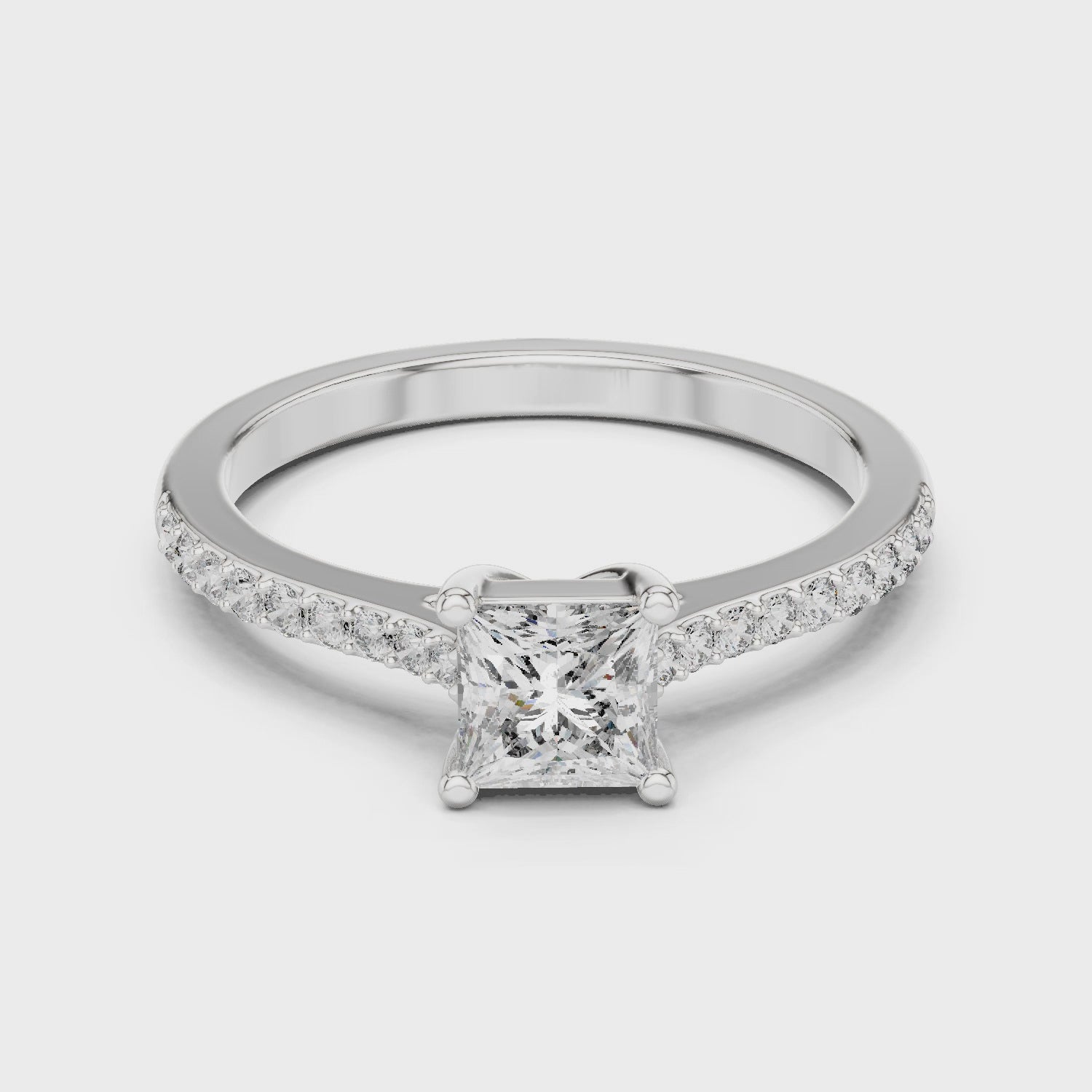 Stones: Princess-Cut Diamond, 1 × 4.50 × 4.50 mm (≈0.45 ct) + Round Brilliant Diamonds, 10 × 1.30 mm (≈0.010 ct each) + 6 × 1.20 mm (≈0.008 ct each) + 2 × 1.10 mm (≈0.006 ct each) → Total ≈0.61 ct (grade per selection; lab-grown standard, natural on request)