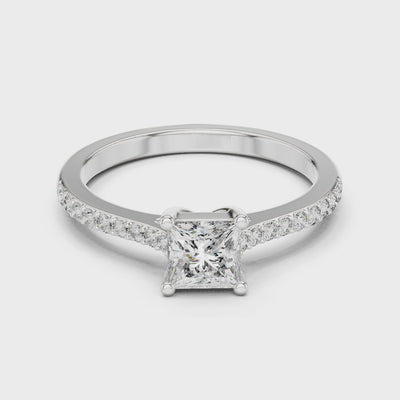 Classic lines meet modern precision in this MUUR Fine engagement ring. A square princess-cut diamond is held in a refined four-claw head with an open basket that lifts light through the stone. Delicate micro-pavé round brilliants taper along the shoulders, drawing the eye to the center while keeping a balanced, low-to-medium profile for everyday wear. The shank is a slim, comfort-fit band with clean outer edges that stack neatly with a wedding band. Crafted in 14K yellow gold and available in 18K, platinum, or sterling silver. Responsibly grown lab diamonds come standard for vivid fire and traceable sourcing; natural diamond is available on request. Each ring is hand-finished to a high polish with crisp prongs, smooth interiors, and careful tolerances—refined, durable, and unmistakably MUUR Fine.