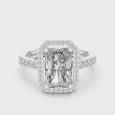 Setting architecture: Radiant collet basket with four corner prongs; square micro-pavé halo; micro-pavé shoulders