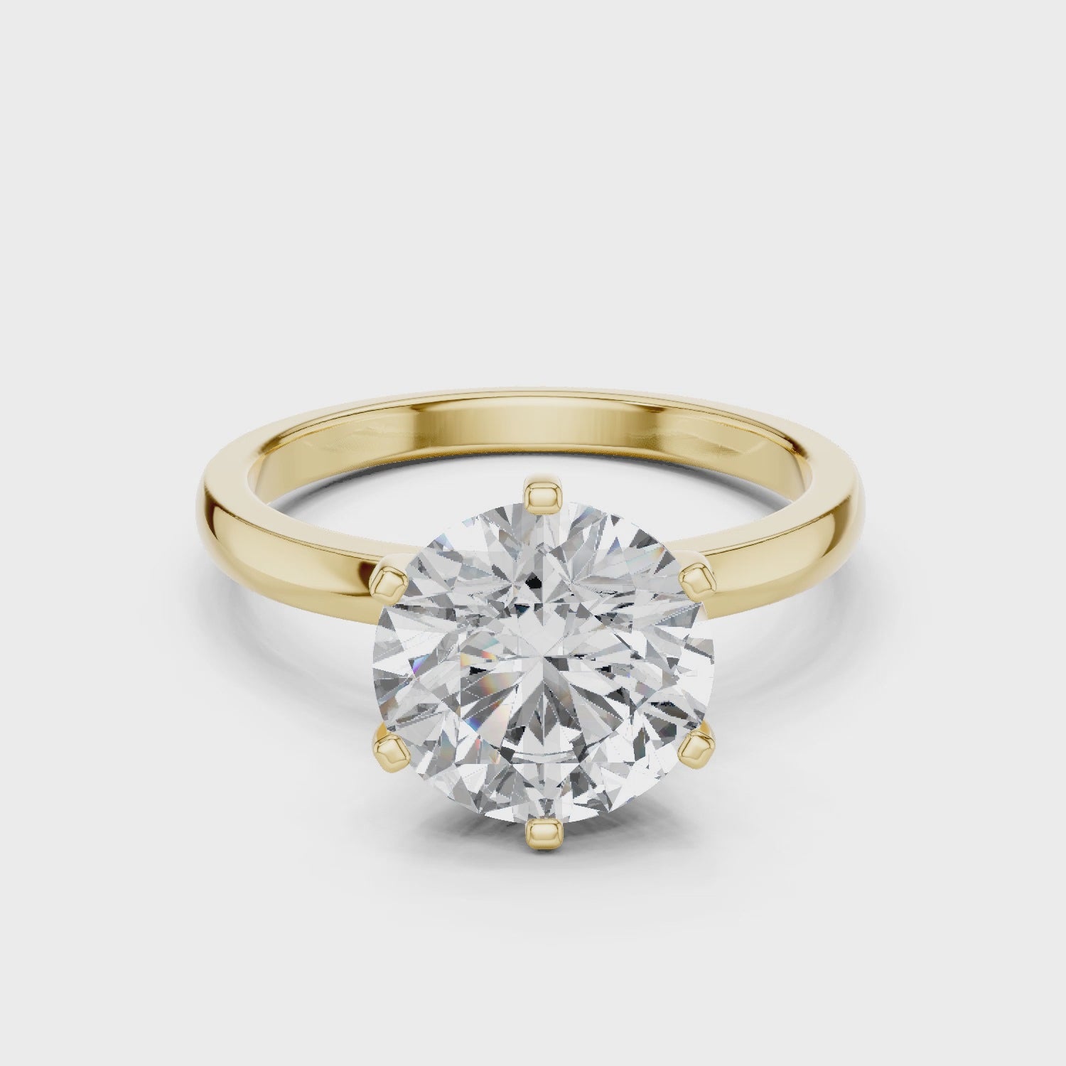 A timeless MUUR Fine solitaire, this ring features a round brilliant center of approx. 8.20 mm (~2.10 ct) presented in a refined basket crown with four protective prongs. The open gallery and softly arched, cathedral shoulders elevate the stone for maximum light return, while the tapered half-round band keeps the silhouette slim and elegant for everyday wear. Crafted in 14K yellow gold with a high-polish finish (also available in 18K and Platinum), the design balances strength and delicacy so the diamond remains the focus. Choose an ethically created lab-grown diamond or request natural—each stone is selected per your preferred color/clarity. Custom sizing and engraving are available to make it uniquely