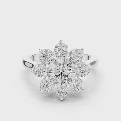 A luminous flower-cluster from MUUR Fine, this ring centers a brilliant 7.0 mm round diamond encircled by eight perfectly matched round accents for a high-sparkle halo. Each stone sits in a refined collet cup with rounded claw prongs that keep the facets open to light while securing the edges. The head is lifted on an airy, architectural gallery with supportive struts, and gently cathedral shoulders taper into a smooth comfort-fit shank—balanced in height for everyday wear yet striking enough for formal occasions. Crafted in 14K yellow gold with options in 18K, platinum, or sterling silver. Responsibly grown lab diamonds come standard for brightness and traceable sourcing; natural diamond available by request. Hand-finished to a high polish with crisp prongwork and precise tolerances: a timeless, showstopping cluster that feels beautifully refined.