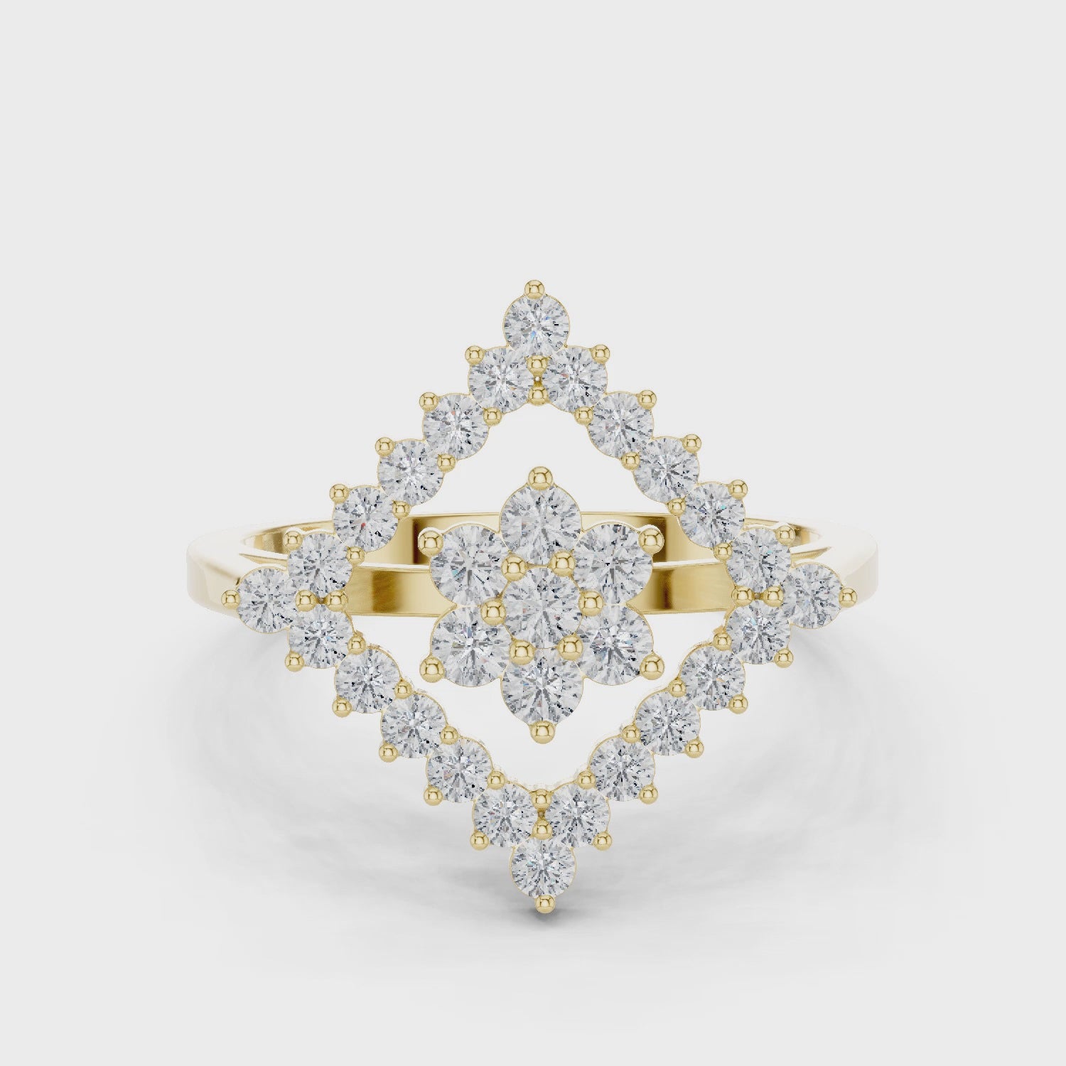 A graphic take on a classic cluster, this MUUR Fine ring sets a flower of round brilliant diamonds inside a crisp square halo for striking finger coverage without bulk. Seven 2.0 mm rounds form the raised center cluster, surrounded by twenty-four 1.6 mm pavé diamonds in collet baskets with neat round prongs. The open geometric gallery keeps the silhouette light while allowing maximum light return to the stones. A refined half-round shank tapers toward the shoulders for comfort and balance. Crafted in 14K yellow gold (also available in 18K, 10K, 22K, platinum and 925 silver), the design delivers everyday wearability with statement sparkle. Choose ethically grown lab diamonds as standard, or request natural diamond selection. Made to your size with optional engraving and stone upgrades.