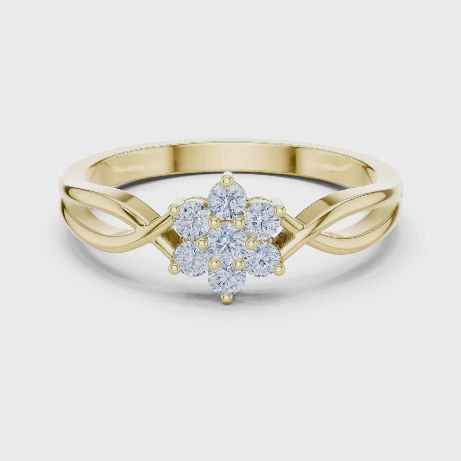 A delicate seven-stone cluster that blooms on the hand. From MUUR Fine, this 14K yellow-gold ring arranges round brilliant diamonds into a classic flower—one 2.0 mm center encircled by six 1.8 mm accents—for a refined sparkle with everyday ease (approx. 0.185 ct total). Each stone sits in petite collet cups with neat bead/prong tips, while softly split shoulders frame the head for a graceful, feminine silhouette. The half-round band balances comfort with durability and a low profile that won’t snag, making it perfect as a promise ring, right-hand ring, or petite engagement style. Choose ethical lab-grown diamonds as standard, or request natural stones to your specification. Hand-finished with a high polish, this timeless cluster pairs beautifully with slim pavé bands.