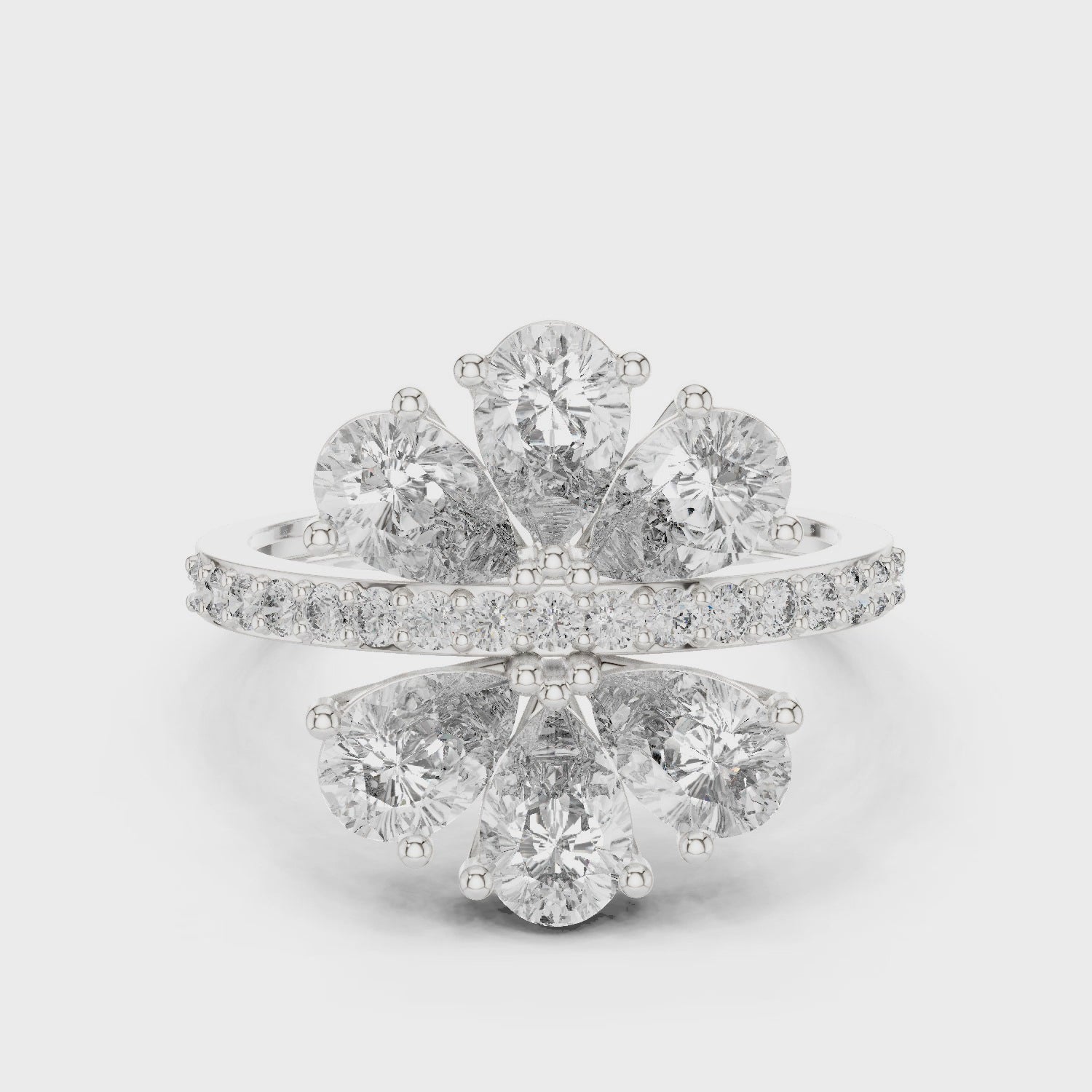A luminous floral statement from MUUR Fine, this six-leaf cluster ring arranges pear-cut diamonds into a modern clover and sets them on a tapering pavé band of 14K yellow gold. Six pears (approx. 6.0 × 4.0 mm each) crown individual basket collets, secured with refined round prongs for maximum light return and crisp outline. Graduated melee diamonds trace the shoulders in micro-prong settings, adding a continuous ribbon of sparkle without bulk. An airy, open gallery keeps the profile light while lifting the motif just above the finger for comfortable wear and easy stacking. Hand-finished in a high polish, this piece balances sculptural presence with delicate detail—perfect as a right-hand ring or an alternative engagement style. Choose your diamond preference and metal to create an ethically minded heirloom that reflects your taste.