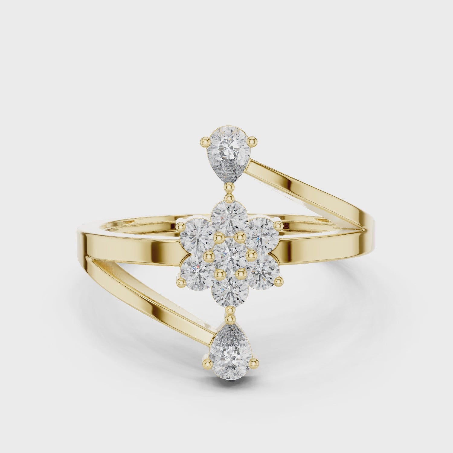 A modern take on the floral cluster, MUUR Fine’s split-shank diamond ring pairs soft curves with crisp geometry. Seven round brilliant diamonds bloom at center while two pear-shaped accents (approx. 3.5×2.5 mm) taper the motif, creating a graceful north-south silhouette that flatters the hand. Each stone is seated in a protective collet cup with refined prongs for light return and everyday security. The shoulders divide into a clean split-shank, then taper to a comfortable half-round band that sits low and balanced. Crafted in 14K yellow gold with a high-polish finish, this style can be set with lab-grown or natural diamonds to suit your values. Thoughtfully engineered for sparkle without bulk, it’s an elegant choice for a right-hand statement or an alternative engagement ring.