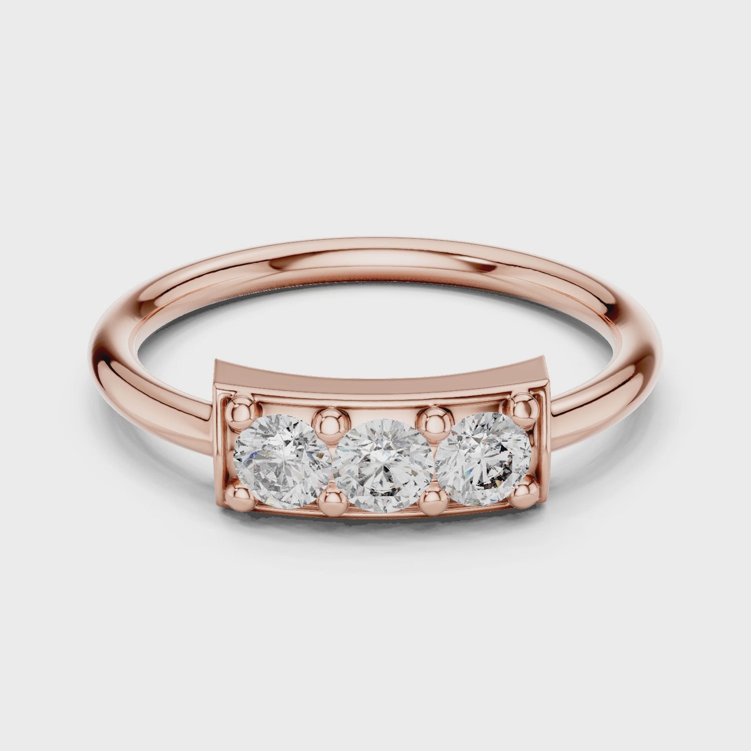 Clean-lined and luminous, this MUUR Fine three-stone ring sets round brilliant diamonds into a sleek horizontal bar that sits low and comfortable on the hand. The framed bar functions like a modern collet: open at the back for light and finished at the face with precise bead prongs that secure each stone while keeping the profile minimal. A non-cathedral gallery and slim half-round shank make it an elegant everyday piece that stacks neatly with bands yet has enough presence to wear solo. Crafted in 14K yellow gold with options in 18K, platinum, or sterling silver. Choose responsibly grown lab diamonds (or natural by request); every ring is hand-finished to a high polish with careful tolerances for long-term wear.
